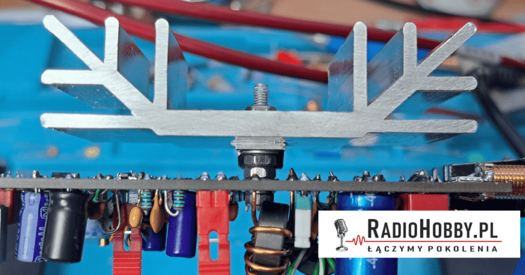 Kończymy lutowanie. Ostatnie zadanie to przykręcenie radiatora do tranzystora RD16HHF1. W naszym wykonaniu to śruba ampulowa M 3×20 i skręcanie na kanapkę 🙂 Od góry PCB podkładka śrubaod spodu podkładka i nakrętka M3, w naszym przypadku kolejna nakrętka i podkładka dały dobrą wysokość by po nałożeniu pasty termoprzewodzącej przykręcić radiator. O wielkości radiatora może uda nam się coś jeszcze napisać. Ważne by na etapie uruchamiania mieć zamontowany radiator. Jeżeli zamontujemy zbyt mały kawałek przypadkowej wielkości blaszki możemy narazić tranzystor na pracę w wysokiej temperaturze co może spowodować jego trwałe uszkodzenie.