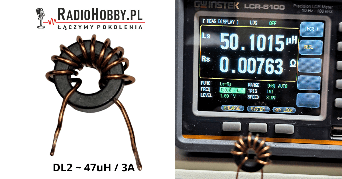 Do nawinięcia dławika DL2 używamy około 25cm DNE 0.5-0.8mm. Oczywiście, czym średnica drutu większa tym mniejsza rezystancja dla DC ale zachowajmy umiar bo i rdzeń FT50-43 nie jest z gumy a 9 zwojów musi się zmieścić. Przyjęte wartości projektowe to około 47uH jak widzimy na powyższej fotografii użycie drutu 0.8mm 9zw. dało nam efekt 50uH i Rs około 7,6mΩ.