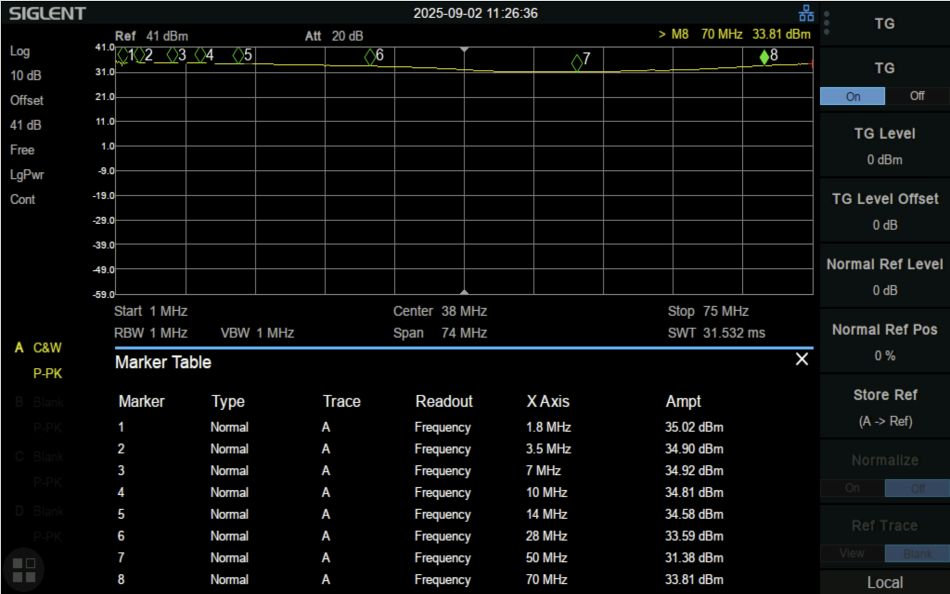Poniżej zamieszczamy zrzuty ekranu z analizatora widma, które ilustrują, jak zmienia się moc wyjściowa wzmacniacza w zależności od częstotliwości.